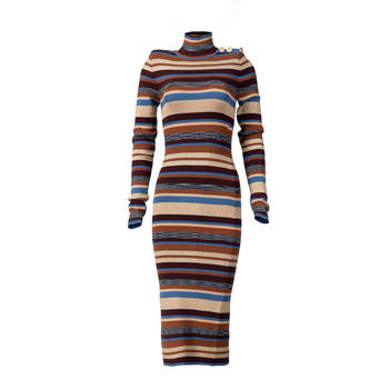 เดรสสเวตเตอร์แขนยาวคอเต่าสำหรับผู้หญิงเดรสมิดิผ้าคอตตอนลายทางออกแบบได้ตามต้องการ